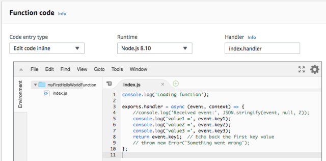 - In the AWS Lambda console, select the AWS Lambda function, myFirstHelloWorldFunction, which you created previously, and navigate to the Function code section to modify the code.