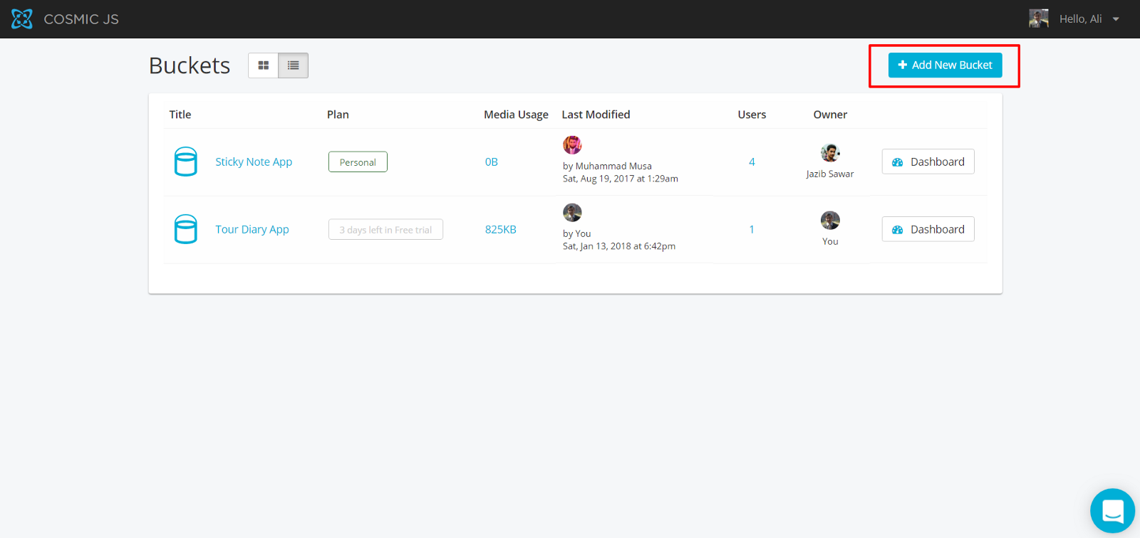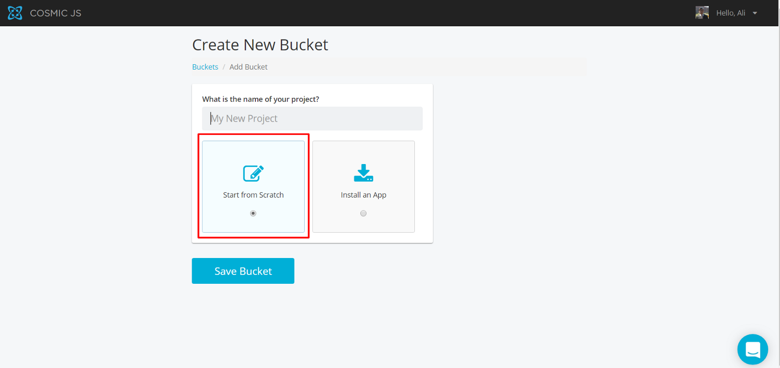 **Setup bucket:**To create the bucket, login to Cosmic JS and click add ‘new bucket’.