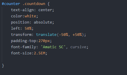 #counter .countdown {text-align:center;color:white;font-family: 'Amatic SC', cursive;font-size:3em;margin:-15px 0 0;}
