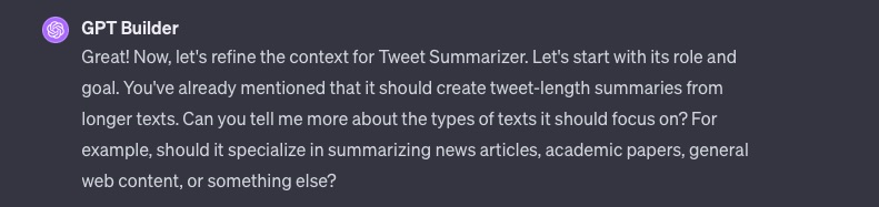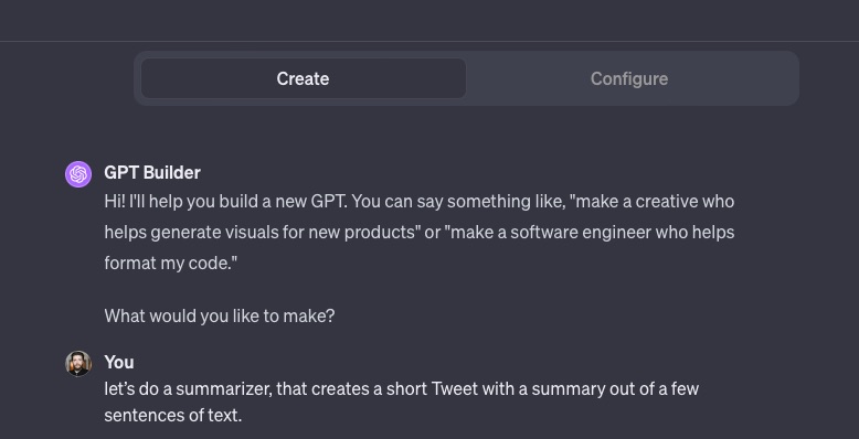 Describe what you want your GPT to do. For example, let’s do a summarizer that creates a short Tweet with a summary out of a few sentences of text.