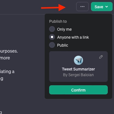 You can save your GPT to continue editing it later, or you can share it with the world!