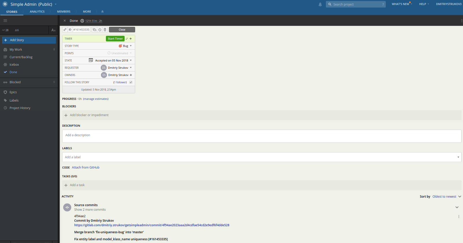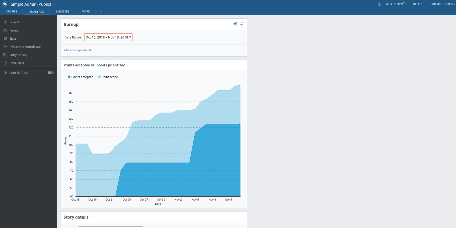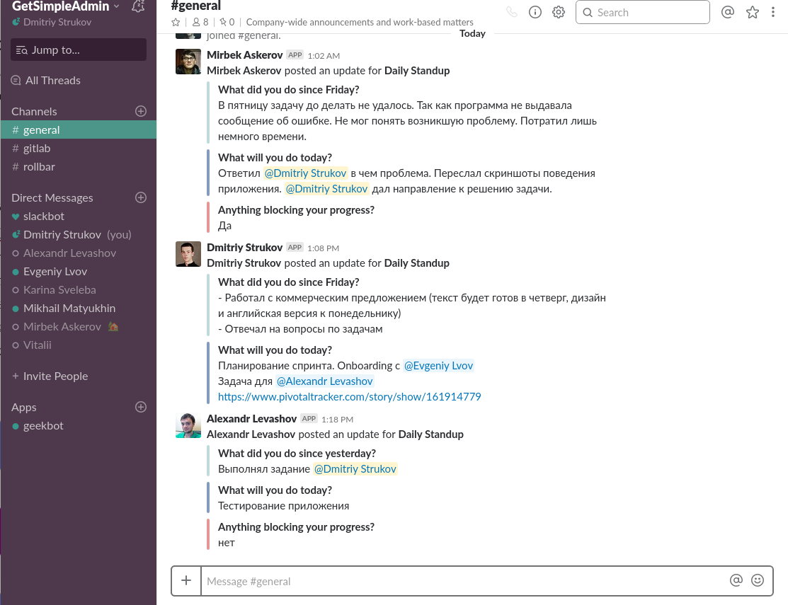Every day we hold meetings, send reports to slack by means of geekbot, on work done by everyone and plans to do today. All project tasks are publicly available. Each task is associated with a specific branch and commit, thanks to the integration of the gitlab + pivotal tracker.