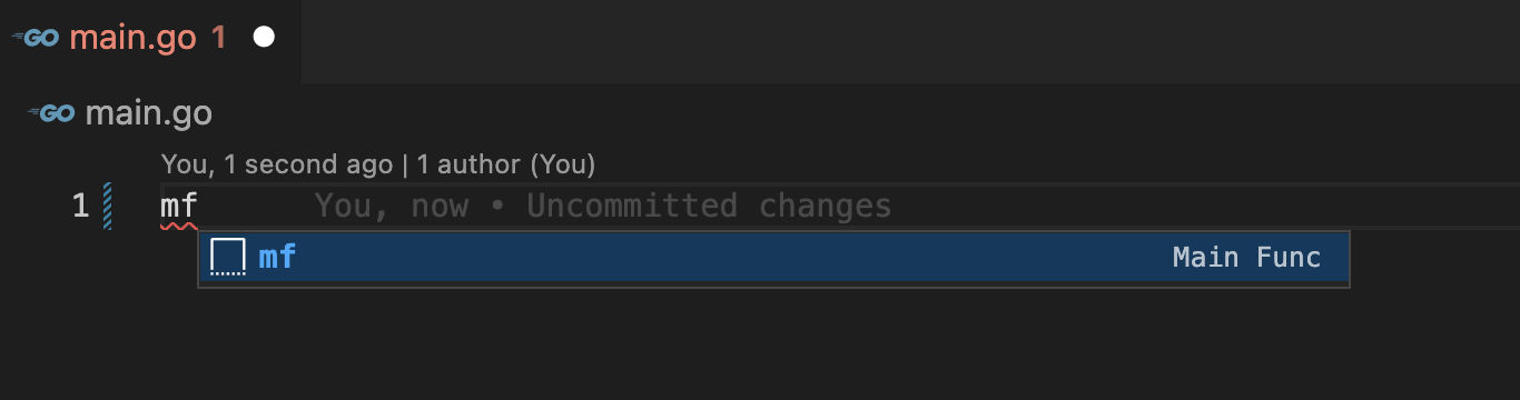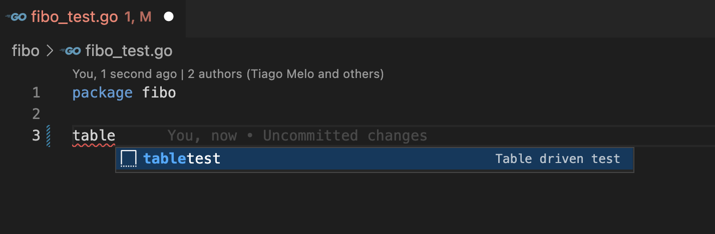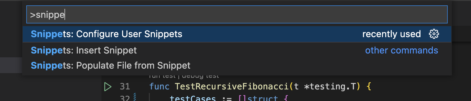 Here's where we'll define a snippet for generating the table-driven test basic structure:
