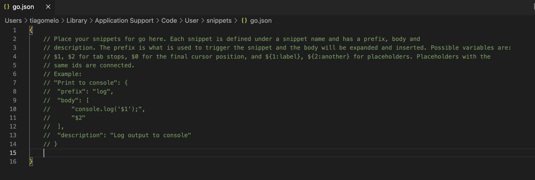 - "func Test${1:YourFunc}(t *testing.T) {": here I'm using "${1:YourFunc}" so the cursor will be positioned around "YourFunc";