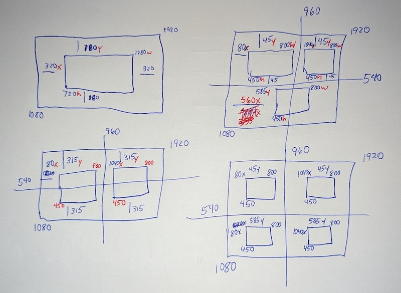 For my demo, I spent some time determining the best values with an intensive 30 minutes with a pen, paper, and calculator to determine the composition values for each possible layout. Please note: I was not a maths or art major as evidenced by the following sketch.