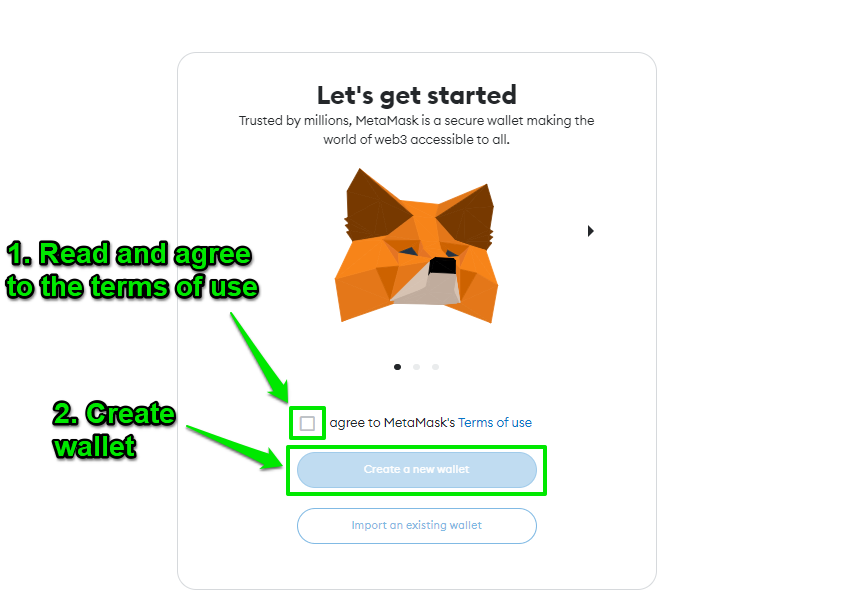 Once the MetaMask wallet extension has been added to your browser, the setup process will start. First, read and agree to MetaMask’s terms of use and click “Create a new wallet.”