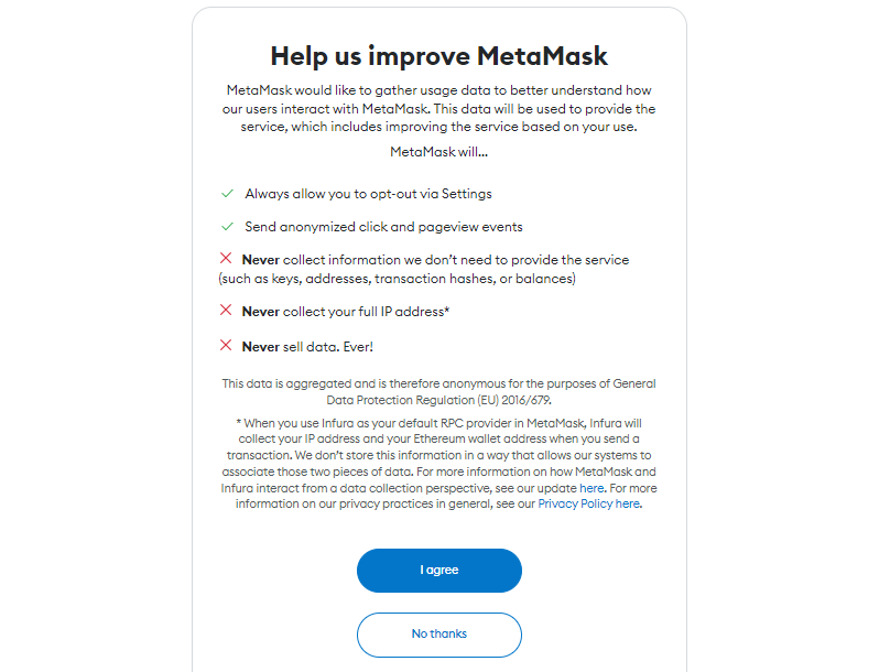 Next, you’ll be asked if you allow MetaMask to collect data on how you use the extension to improve their service. Know that you can click “No thanks” and still proceed with the setup process. It’s up to you.