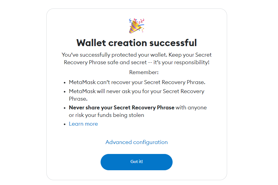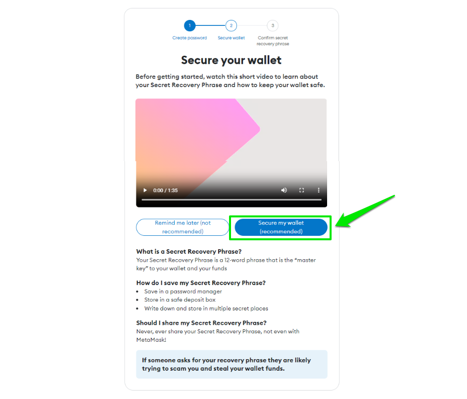 So, take a couple of minutes to watch MetaMask’s video to learn more about how to keep your wallet safe, and read the short summary below. Then, click “Secure my wallet.”