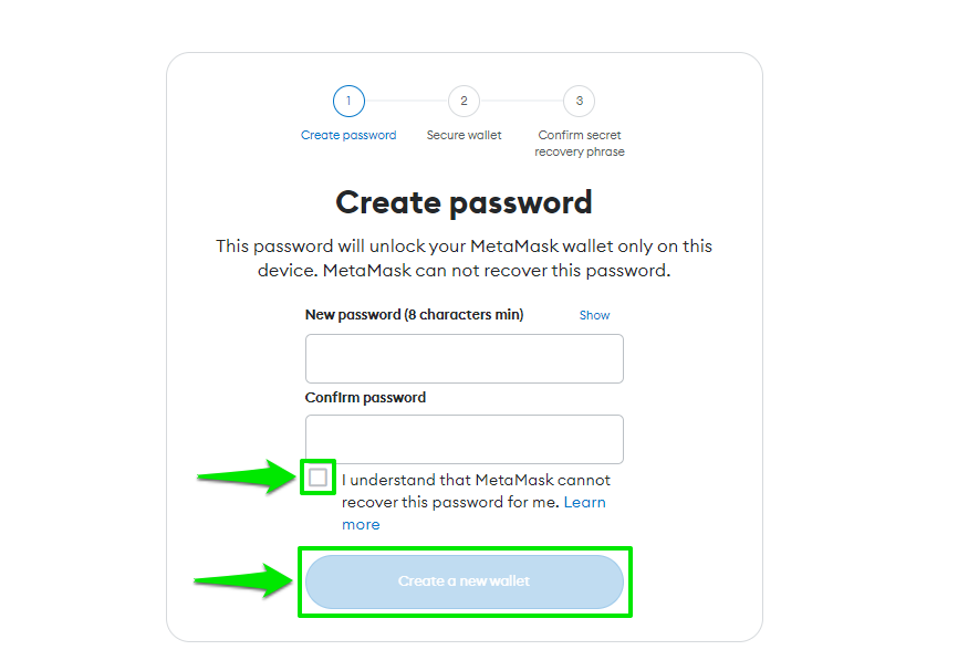 At this point, the actual account setup process will begin. Set up your password, tick the box below it, and click “Create a new wallet.”