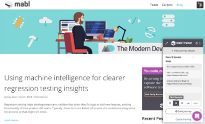 Let’s create another simple Journey that checks to make sure the mabl blog is loading properly. This is a good chance for us to use the Find Elements feature in the mabl trainer, since new blogs are published all the time; we don’t want flakey tests, so searching by CSS property instead of by a dynamic blog title would be much more effective: