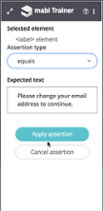 Let’s add a check for this notification label using the Add Assertion feature in the mabl trainer. The trainer supports many types of asserts. In this case, I’ll apply an equals assertion to check that the notification label equals “Please change your email address to continue.”: