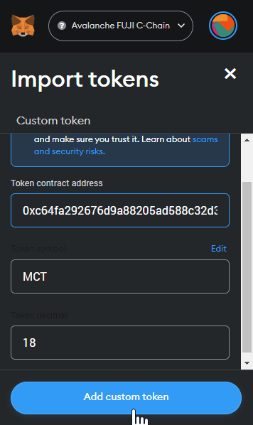 Now that our token exists on a real blockchain, we can add it to our MetaMask wallet. Switch the network on MetaMask to Fuji, and choose Import Token on the Assets tab. Here, you can import a custom token by entering the contract address of your token, the name, and the symbol.