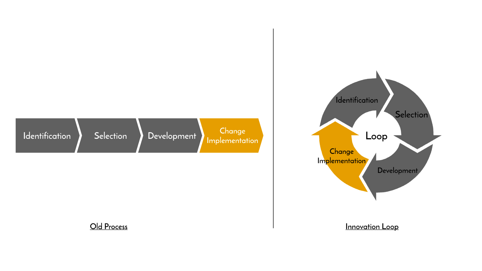 2. Process: All process definition follows a logical sequence of identification, selection, development and change implementation. Most organizations, even the ones that do this well, are more likely to do this linearly. An innovative organization does this in an iterative way (image below). What the extremely innovative companies do is embed this loop approach in all the sub processes that make up sales, hiring, product development etc. It boils down to building agility into all your processes. Adobe figured out the process of innovation to the point that they put it in a box, because it is truly a process and should be replicable for it to truly become a culture.