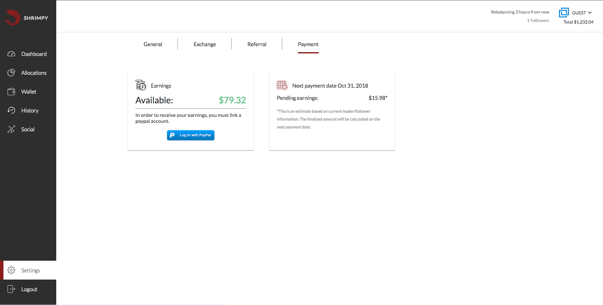 Once you start referring new users and gathered a following in the social program, you will want to get paid. In Shrimpy, the payment process is easy. Navigate to “Settings”, then click on “Payment”. This will show you how much money you have earned in Shrimpy so far.