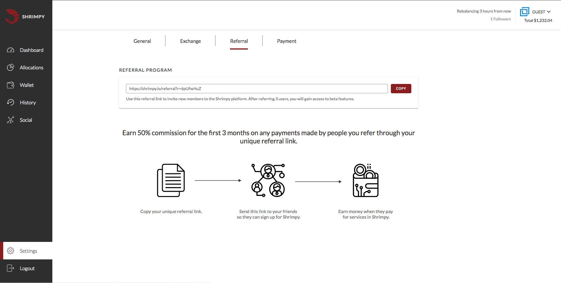That’s right. Every time you refer someone, you get paid $4 per month for the first 3 months that your referral pays for the social features. You can find your referral link by going to the “Settings” tab in the Shrimpy application and then selecting “Referral”.