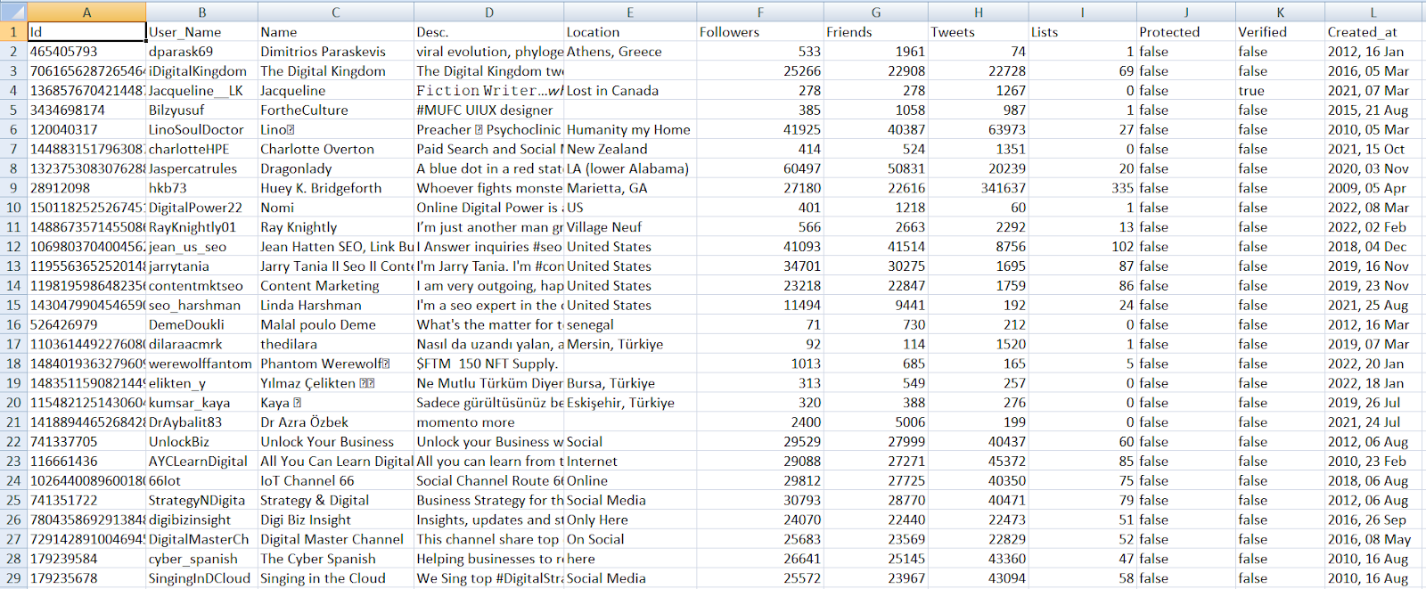 So, what will you expect to get when you download your Twitter followers and friends on Circleboom? You will have a very detailed file regarding crucial information about your Twitter audience.