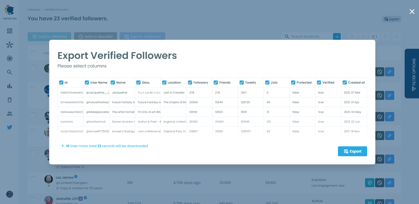 I have 23 verified followers, and Circleboom lists them. You can export them by clicking on the “Export” button at the top right.