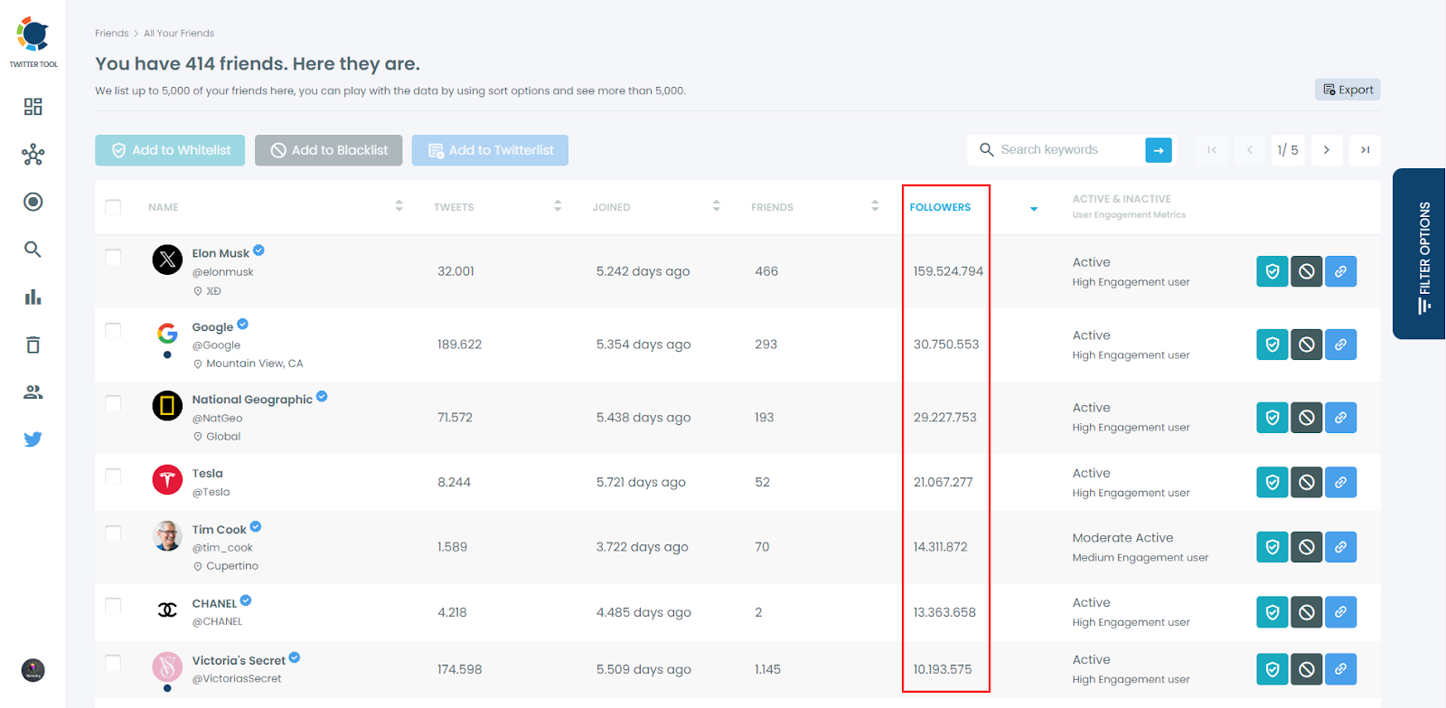 Then, you can apply filters and sort your friends. All are the same with the followers list.