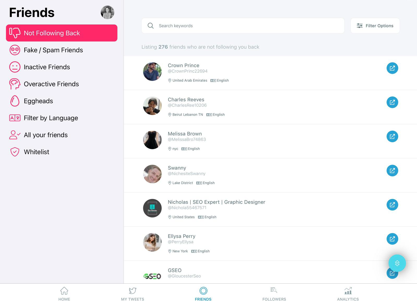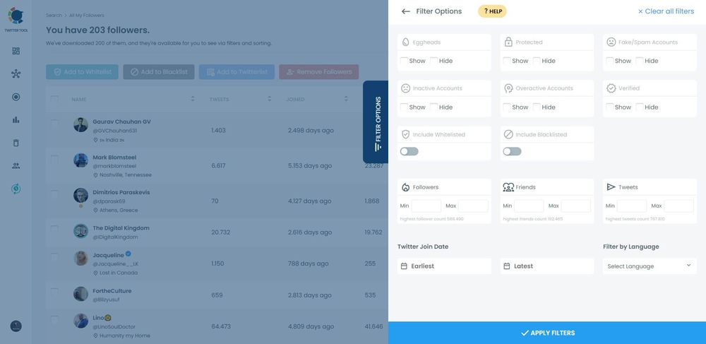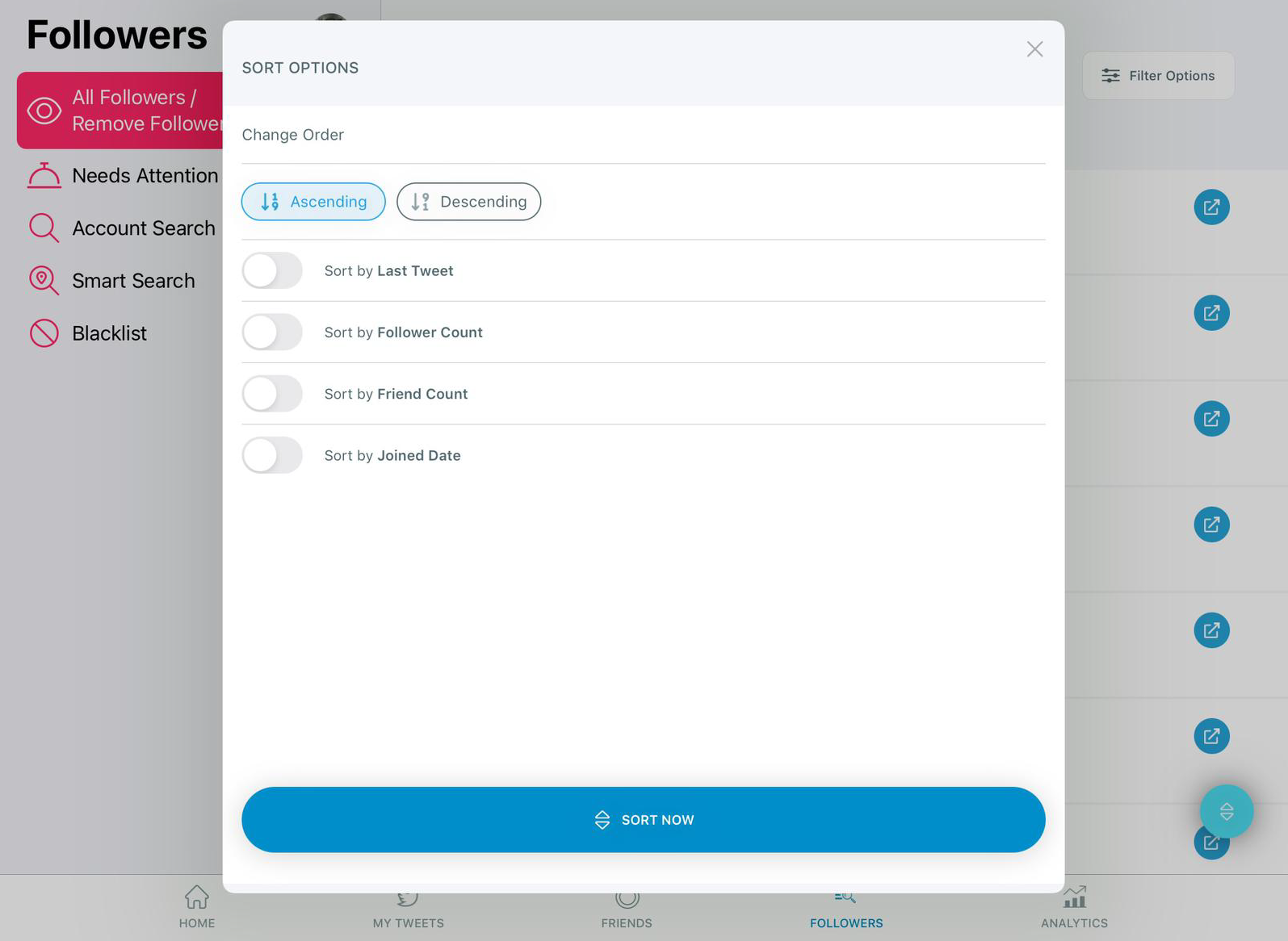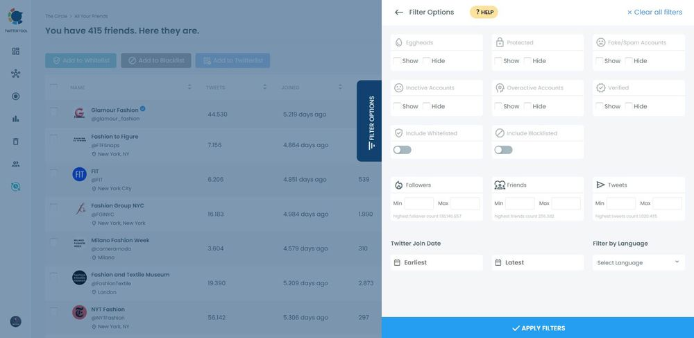 Additionally, you can sort your pals based on how many followers and friends they have. Also, you may filter them based on when they joined Twitter.