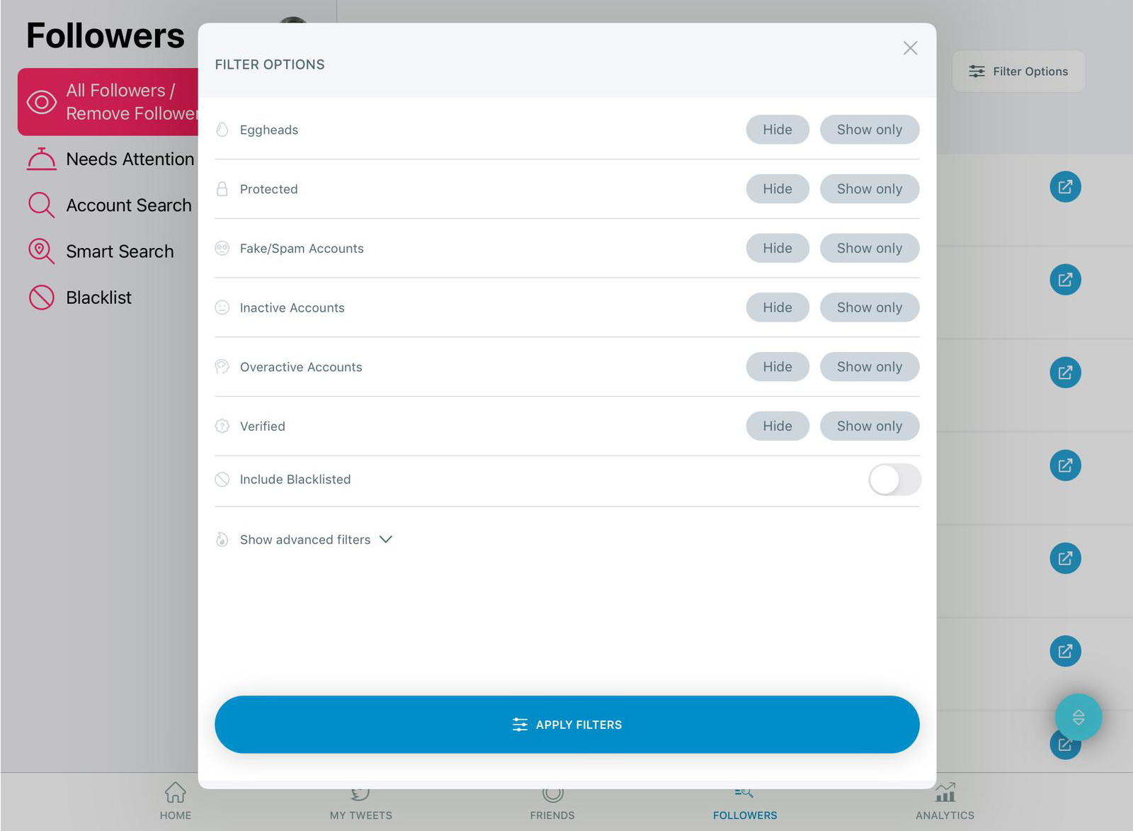 You can further filter your followers based on their following and follower counts.