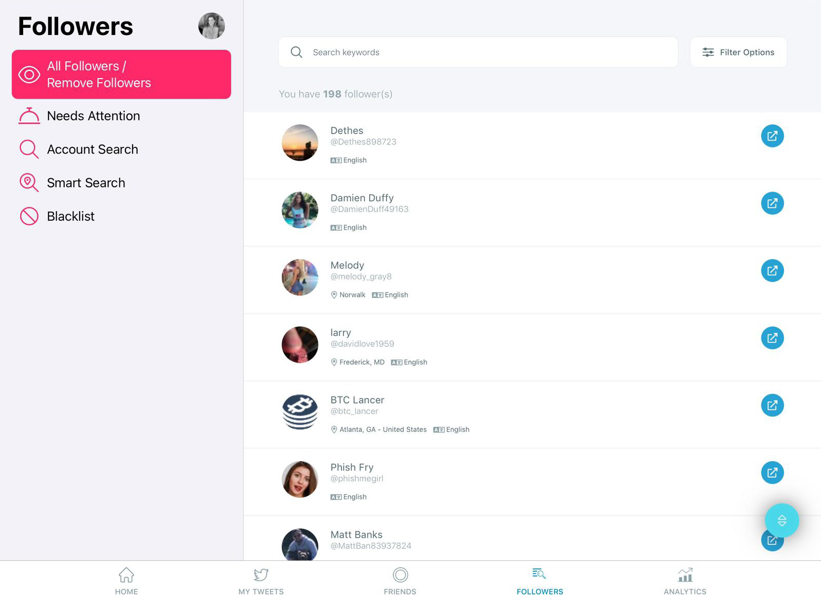 You can list your Twitter followers and apply filters on your iPhone.