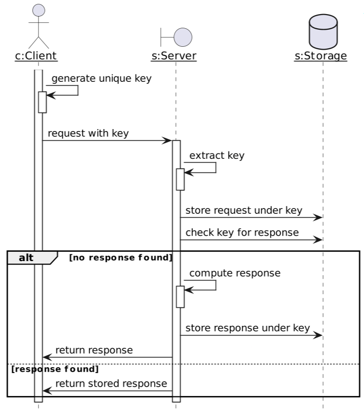 Imagine that the client sending a request sends a unique key along. The server keeps track of key-request pairs. Overall, two things can happen: