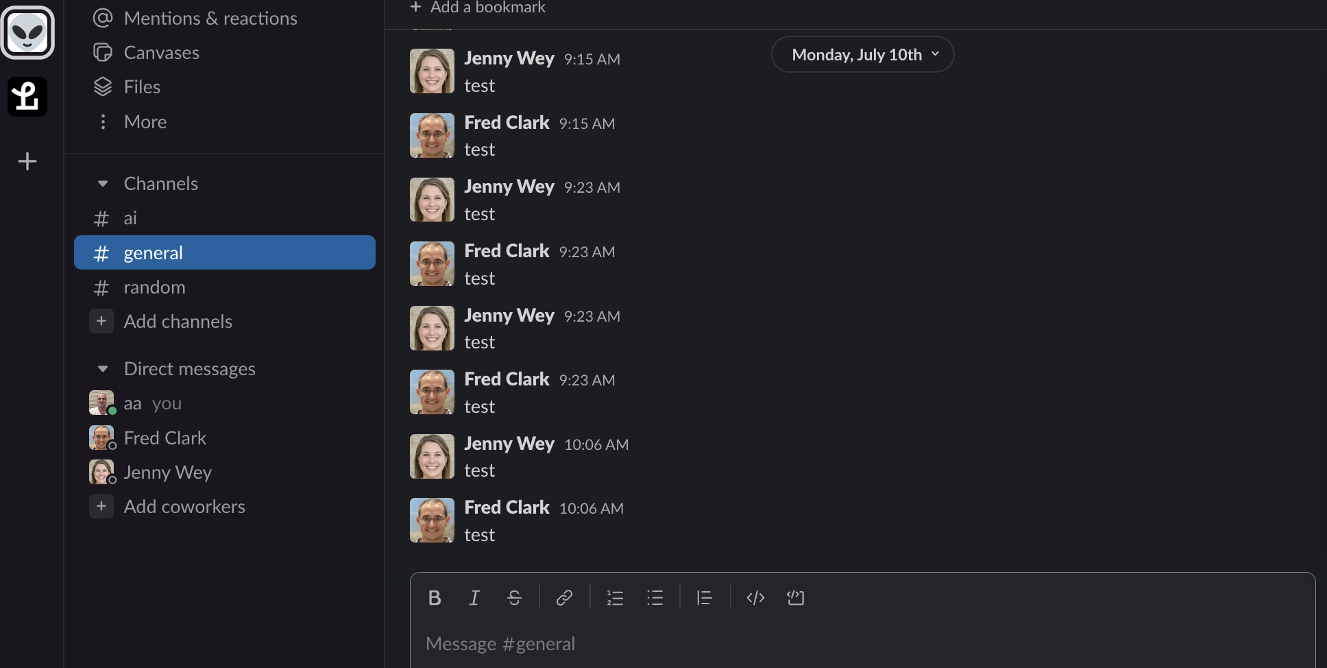 So I asked Chat-GPT for a good name for this project and together we created synapse-system. I had modest dreams. I dreamed I could use slack's api to post as two fake users I created: Fred Clark and Jenny Wey: