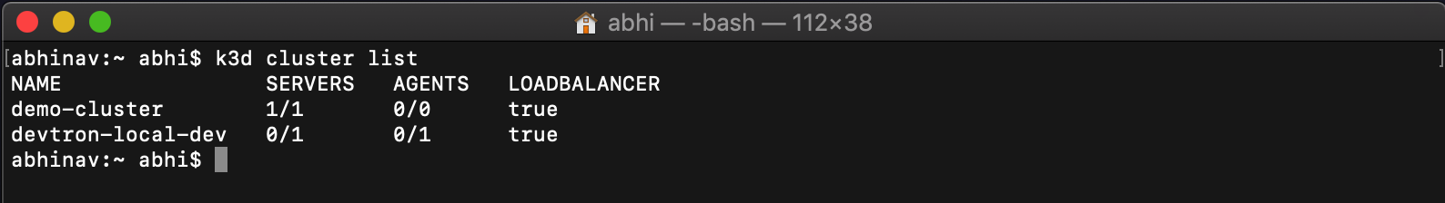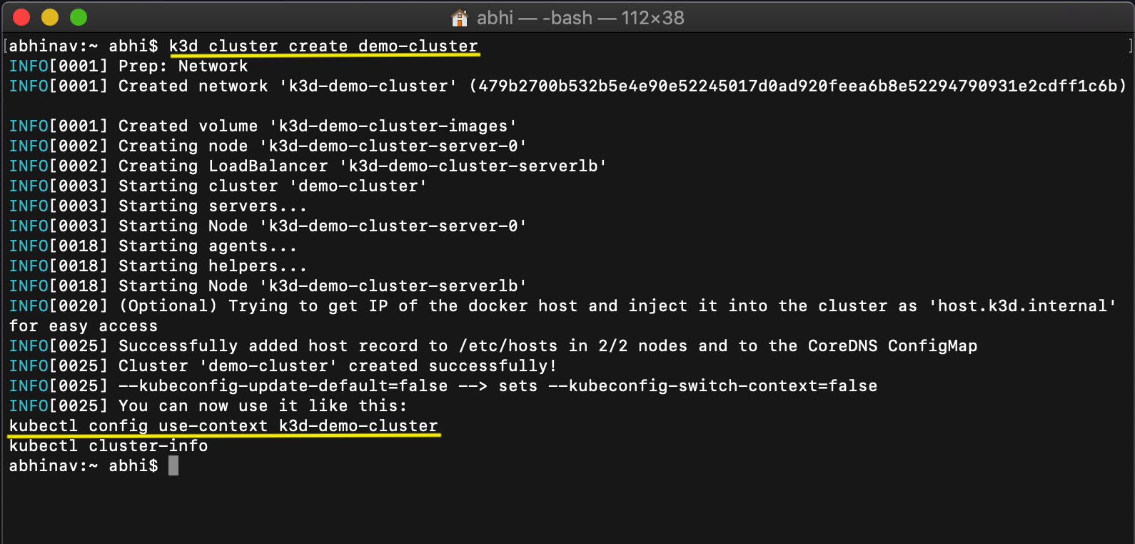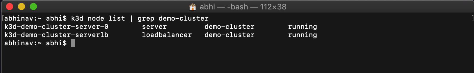 It will create a cluster named demo-cluster in your system and run k3s inside docker containers. To verify whether containers are running or not, please execute $ docker ps,it will list down the container running k3s.