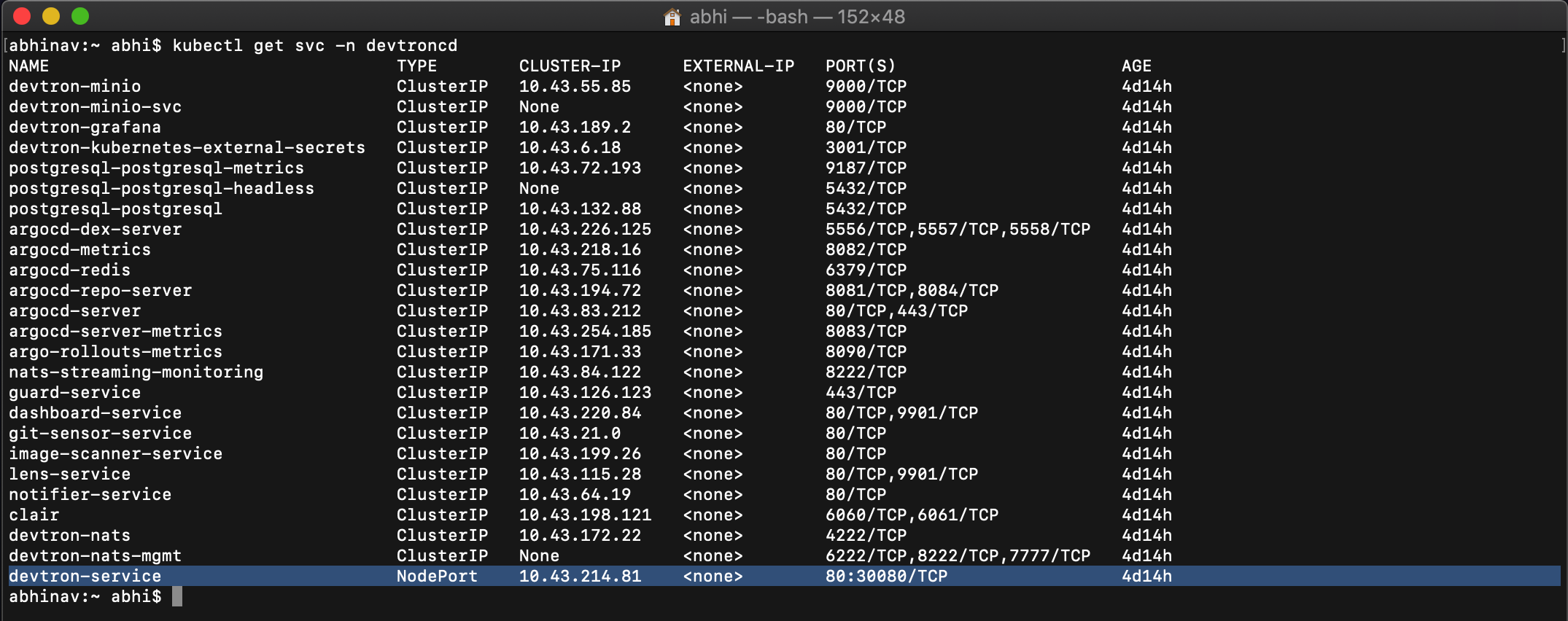 $ kubectl edit svc devtron-service -n devtroncd to edit the service and change the service type to NodePort and NodePort port number to 30080 which you assigned while creating the cluster.