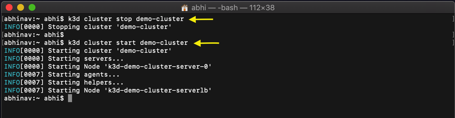 K3d also provides this exciting feature to stop your cluster and again start it where you stopped within seconds. The below command shows how easily you can stop and start your cluster in no time.