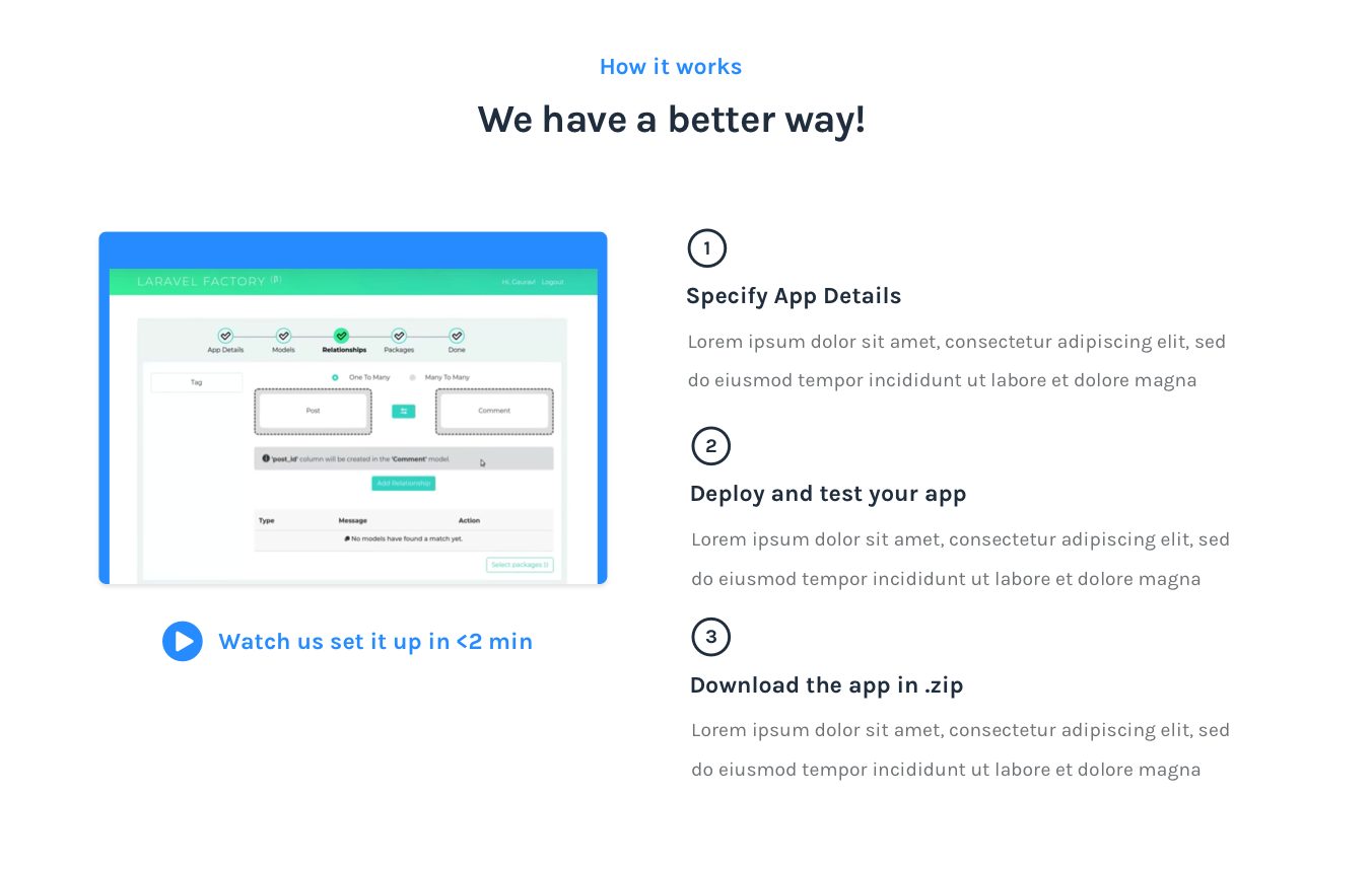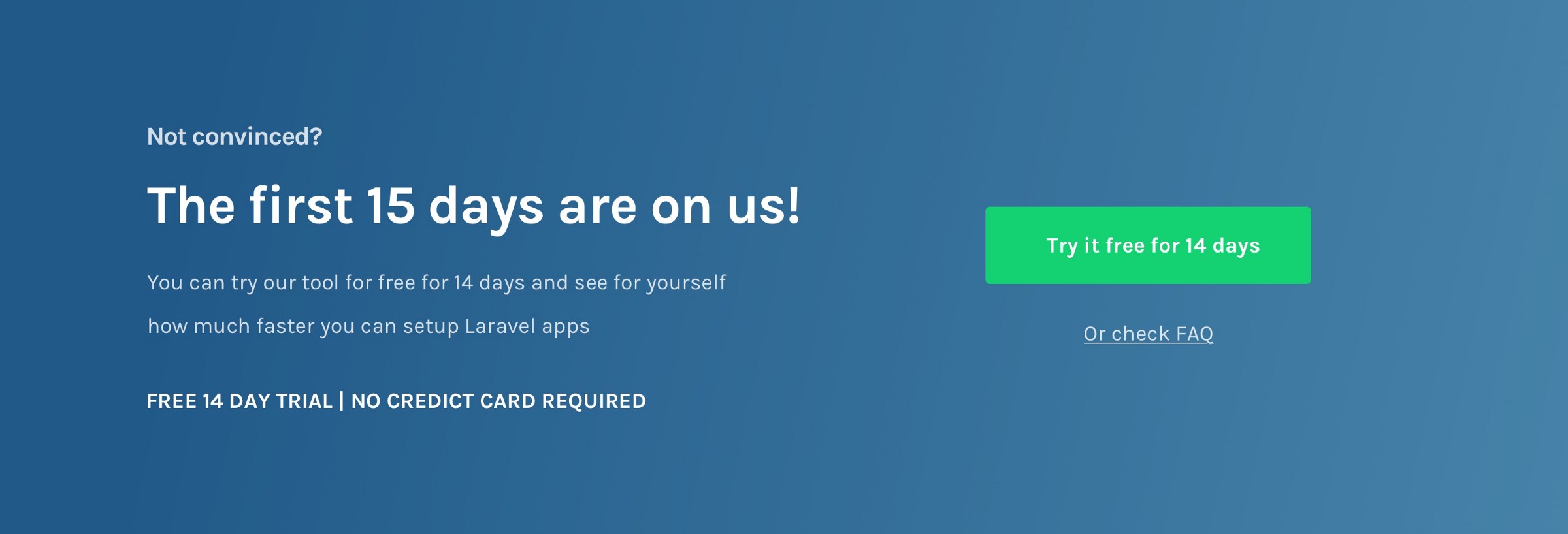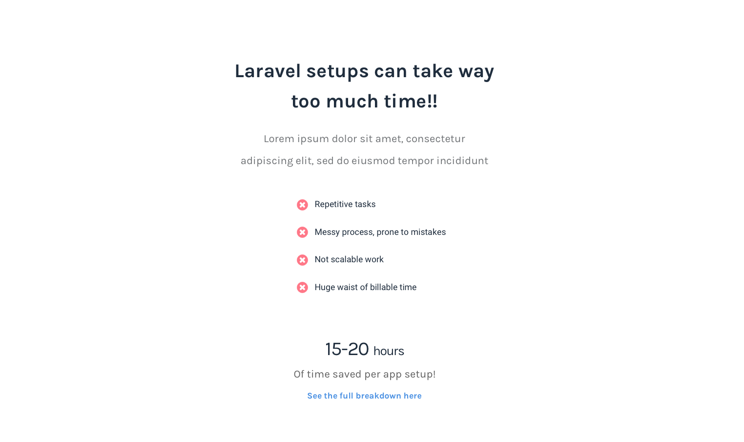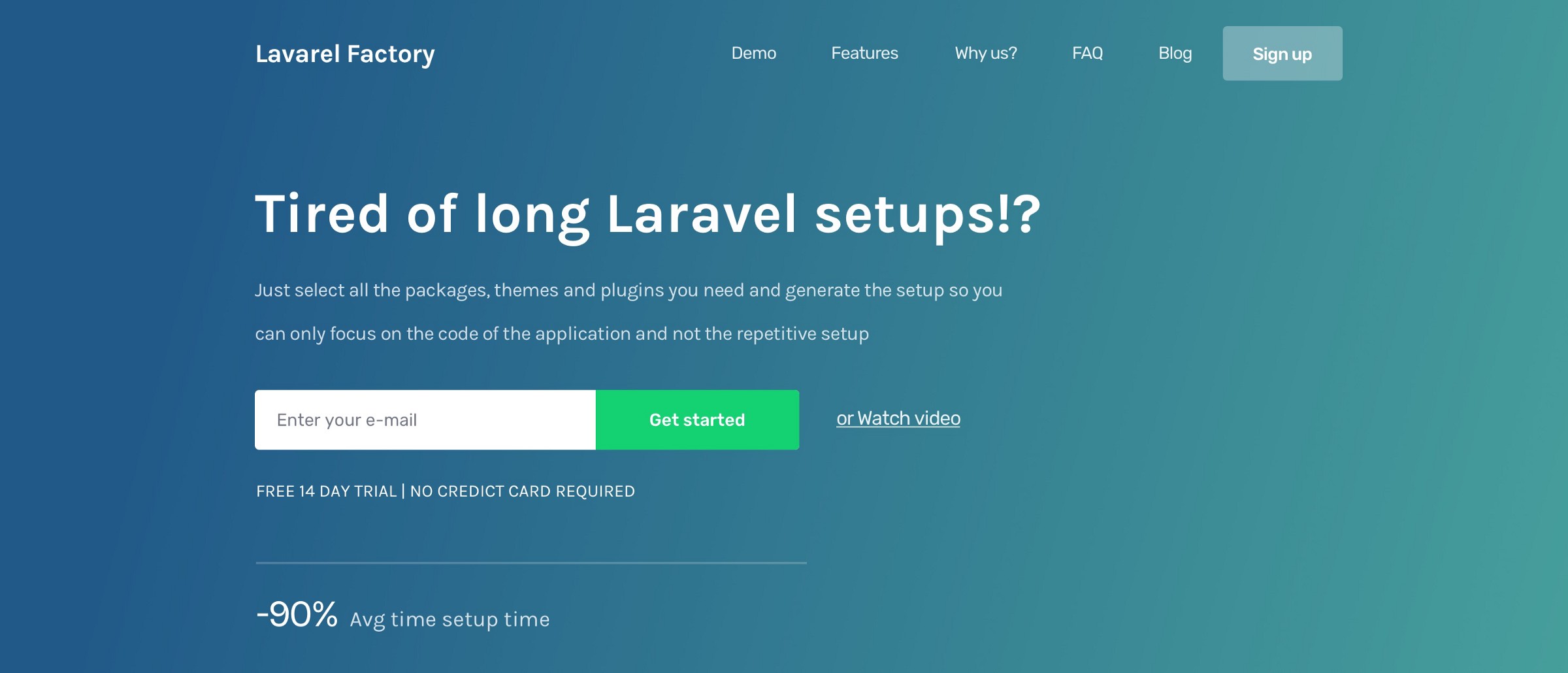 Laravel Factory is a tool that enables you to setup Laravel apps in much less time and with a super easy process, saving around 15–20 hours per setup.