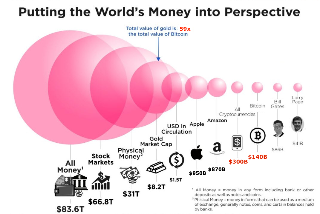 Where are we today? Today, the total market value of all existing cryptocurrencies combined is close to US$300b (billion). Bitcoin alone counts for almost half of it, at US$140b.