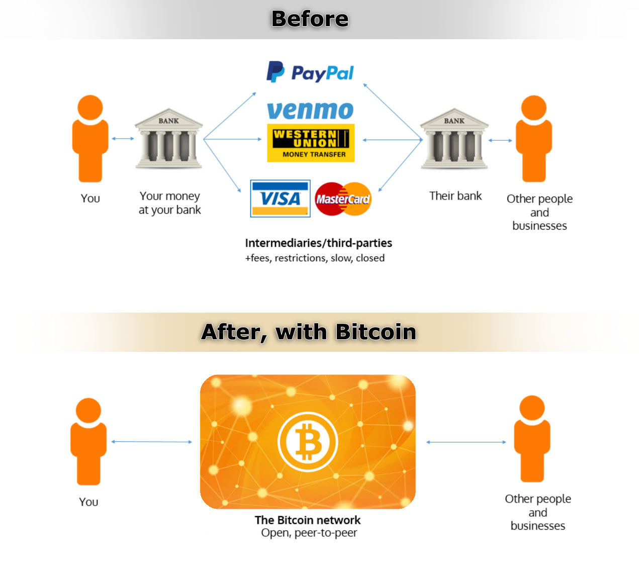 To top it up, a second short history break now: As I said earlier, Bitcoin the first cryptocurrency was launched in 2008. Remember what was going on in the world at that time? Global financial crisis: subprimes, Lehman Brothers etc. Governments had to use a lot of public money — our taxes — to save banks and insurance companies i.e. mainly those who created the crisis. And many people felt that it was unfair. It was in this context that Bitcoin was launched. And the very reason Bitcoin was created was to offer an alternative to traditional money, controlled by a few ‘guys at the top’ i.e. governments and big banks. Indeed, the blockchain technology behind Bitcoin works in such a way that no single individual, no single organisation can have control over Bitcoin: what it’s worth, how much to issue, who owns how much, who’s sending Bitcoins to whom etc. This is essentially the philosophy behind Bitcoin: a ‘better’ money with no oversight from a country, a company or a group of individuals. The technical term is that Bitcoin is a decentralised currency.