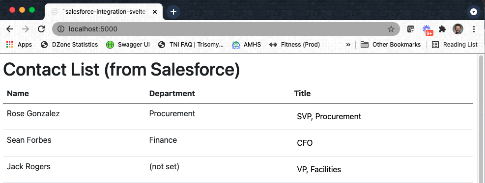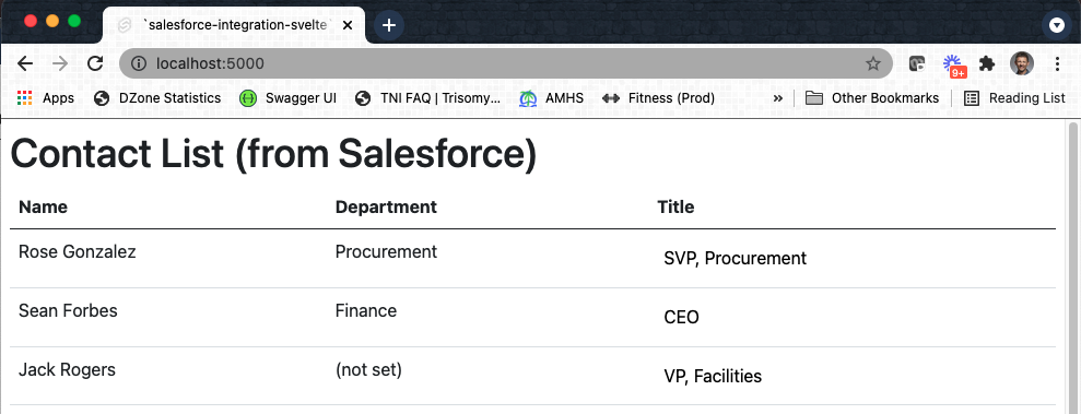 With the changes in place, I executed the npm run dev command again. After making sure the Spring Boot RESTful service was running and connected to Salesforce, navigating to localhost:5000 presented the following information: