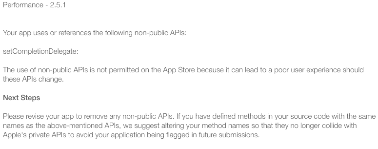 Turns out we are using an API called setCompletionDelegate. A quick check in our code — nope, we don’t use this function. We then looked at all the libraries. Everything was great. And then we finally looked at the Pods and voila, good old Branch API was using this function. A quick chat with the good folks of Branch.io , turns out we were 3 versions behind! After a brief wrestle with “pod update” and “pod install” and “pod unistall” and “pod wtf”, we got everything updated with Branch.