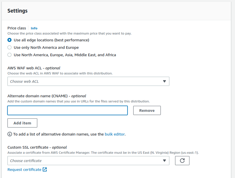 On the “Settings” block choose an alternate domain. This will be the new domain where your WordPress site will be accessible through CloudFront.