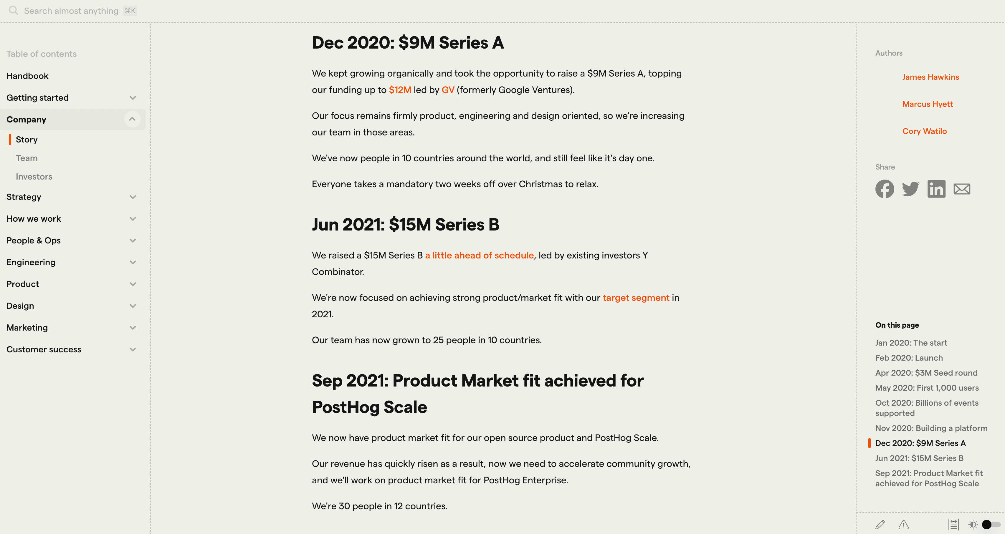 In the PostHog’s handbook, they have a page called Story. It succinctly shows the milestones the company has hit so far. For each milestone, they offer a clear and concise explanation of what happened, sometimes no longer than a sentence. As a result, candidates can get a good idea of how things are going in less than a minute. That’s something to aspire to.