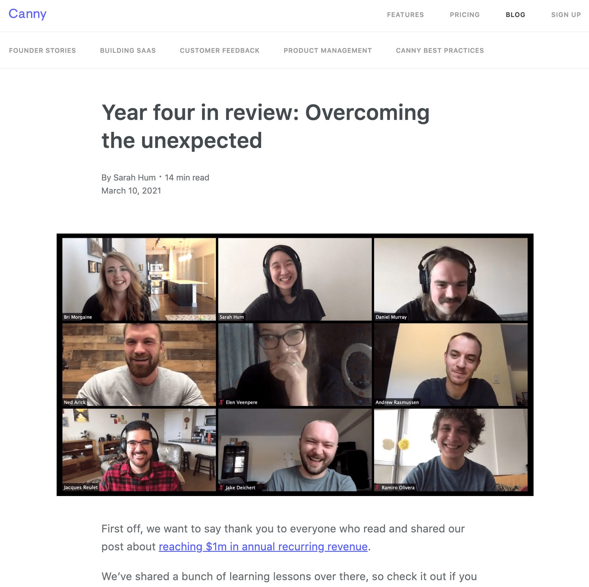 Instead of declaring that “the founders are reflective, thoughtful, and persistent,” show them how so, like Sarah from Canny does by writing comprehensive year-in-review blog posts for four years in a row.