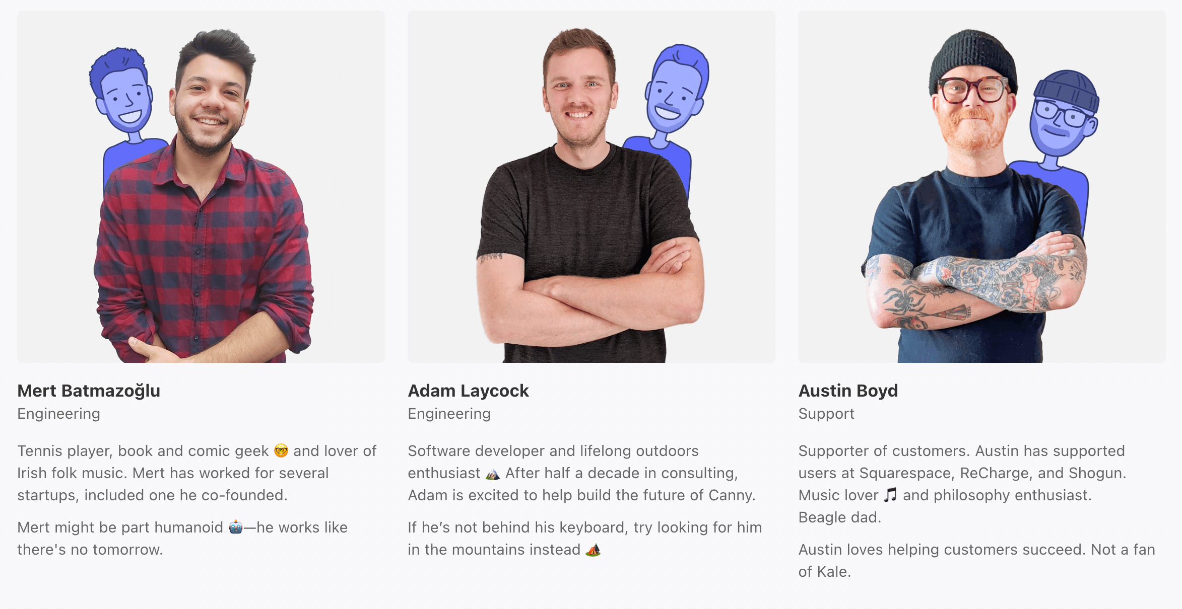 Look how specific those bios are. In most cases, all you get here is a generic “developer” or “marketer” without any personal details. Bios of robots, not people. No wonder nothing comes to mind, except perhaps for Agent Smith. But Canny’s bios are different. When you read them, you can actually imagine the person! They’re Neos in the world of Smiths.