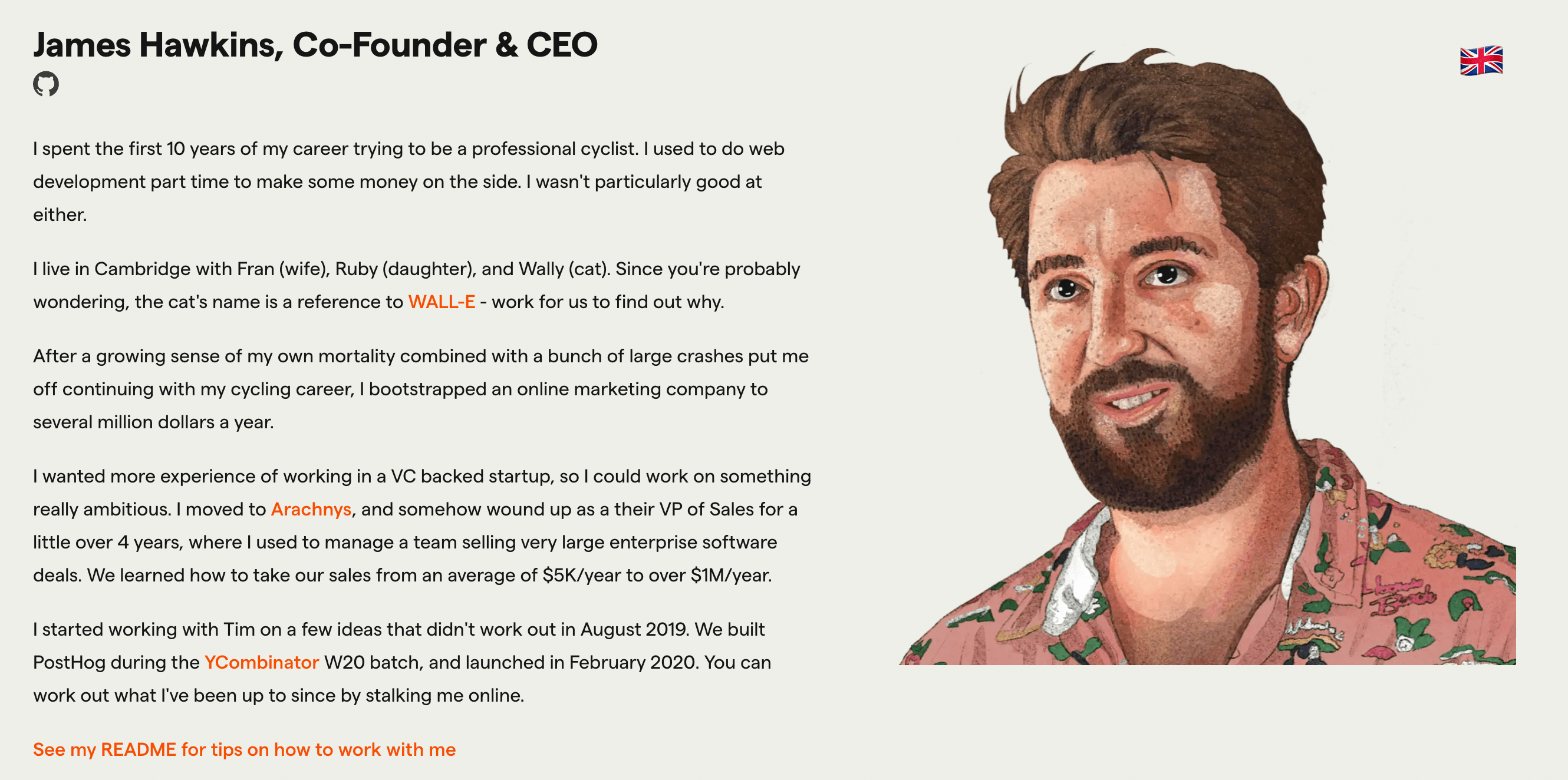 At PostHog, every team member has a well-written, few-paragraphs-long bio and a stylish illustration on the Team section of the PostHog’s Handbook. (Which is a work of art worthy of its own blog post, by the way.) Many team members have their own README files, like the founders do. Check out Lottie Coxon’s, PostHog’s Graphic Designer’s README here, and some others here and here. Even a quick read through these bios and READMEs gives you a good idea of who PostHog has on board.