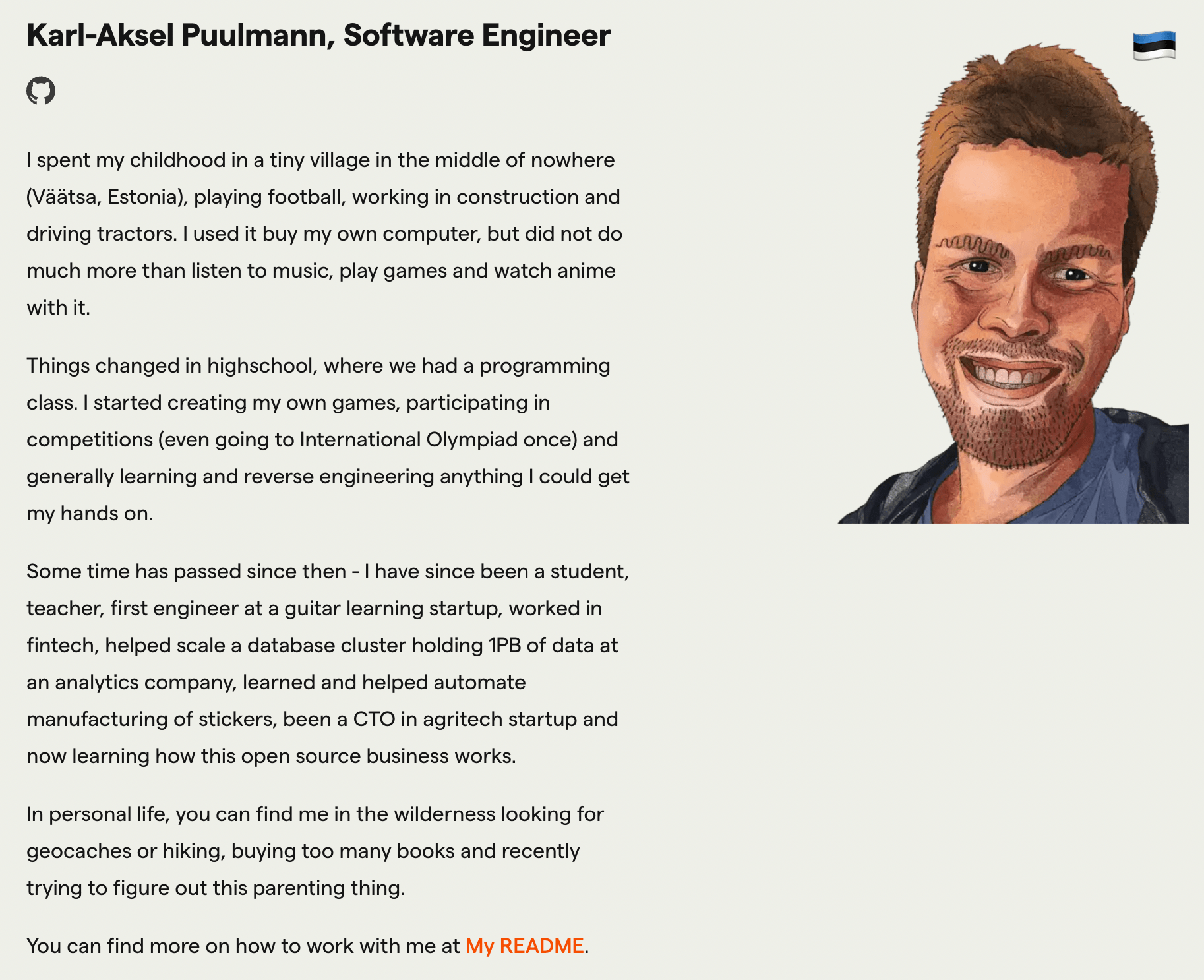 In addition to bios and READMEs, PostHog has a day-in-life video of Lottie, their graphic designer. It communicates a lot more information about what kind of person she is and how working at PostHog feels like than her bio. I wish they had more of those.