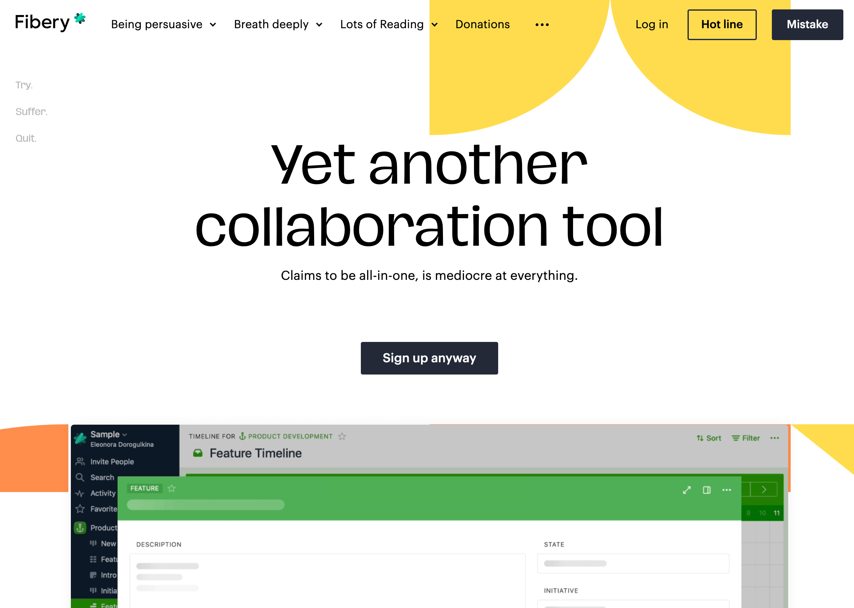 The first project is Fibery’s /anxiety page. Launched in 2019, it mocks every serious enterprise software out there with puns like “Yet another collaboration tool” as the page title, “Mistake” as a sign-up button text, and, my favorite, “Try—Suffer—Quit” page structure.