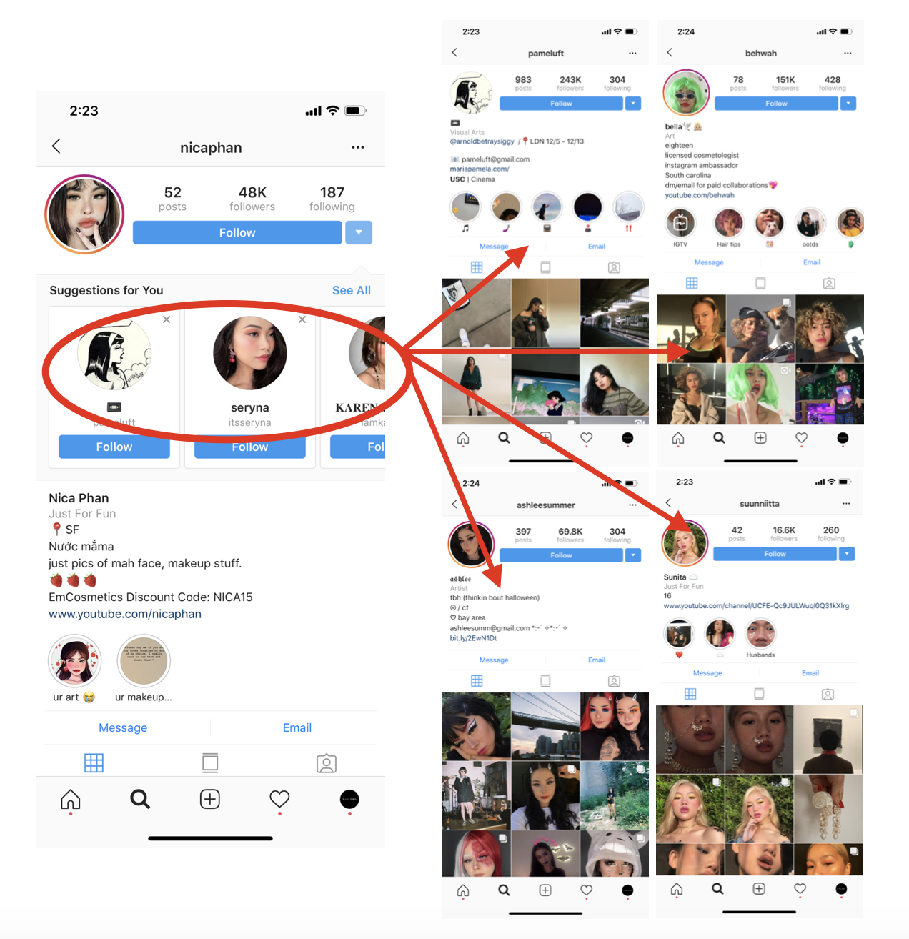 I searched through the “Suggestions for You” accounts from @nicaphan (the first account I found) and discovered over 4 other influencers (@pameluft, @behwah, @ashleesummer, @ssuunniittaa) who have great engagement and fit all my requirements.