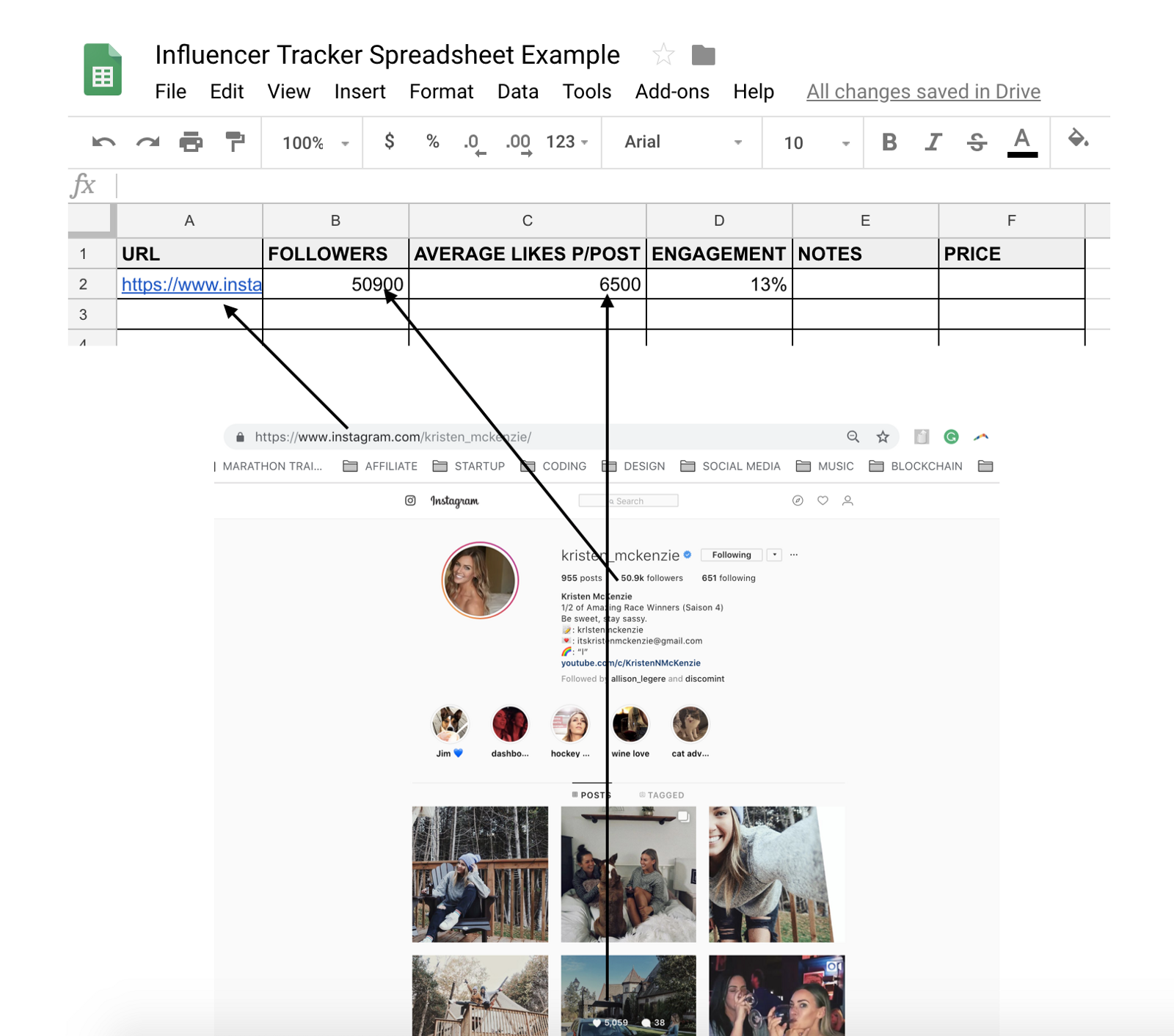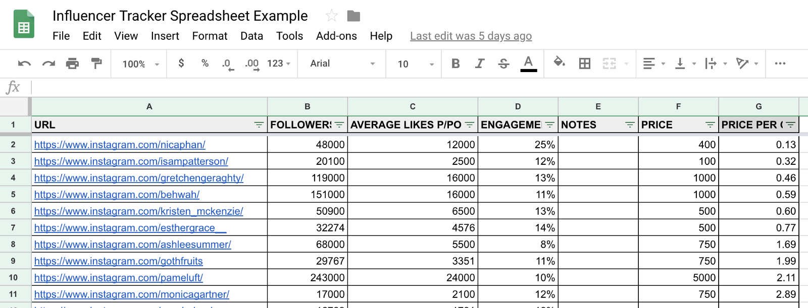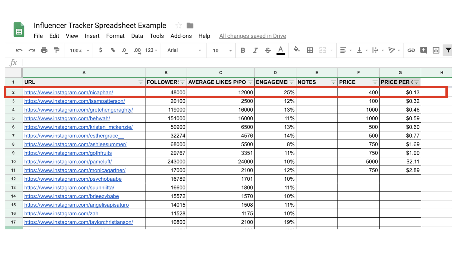 In my case, I like to organize my influencer spreadsheets in the following way: In the URL column you’ll place the URL of the Instagram profile (best to do this on your laptop), in the FOLLOWERS column you’ll include the number of followers of the influencers, for AVERAGE LIKES P/POST you’ll include the average number of “likes” the influencer gets in their 4th through 10th post, for ENGAGEMENT you’ll use the formula ENGAGEMENT = (AVERAGE LIKES P/POST / FOLLOWERS) * 100, in the PRICE column you’ll include the price they give you for the partnership proposal you’ll send them (that’ll be explained later), and in the PRICE PER CONVERSION column you’ll measure the estimated cost per conversion of the influencer, given their engagement and price (this will also be explained later).