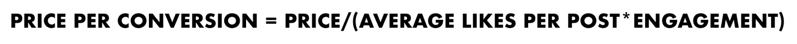 By multiplying the average likes per post by the engagement you are calculating the estimated conversion rate per like, or in other words, the number of people expected to take action based on the influencer’s recommendations (the larger the following and/or engagement, the larger the number of people that take action). When you divide the price by the estimated conversion rate, you will get the estimated cost per conversion, where conversion = a person who takes action based on an influencer’s recommendation. The lower the cost per conversion, the more value you are getting.