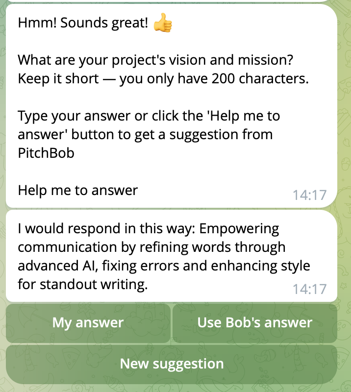 As you respond to the questions, the bot guides you on how to answer better, reformulates your responses, and educates you in certain areas. There are popular options like 'Help Me To Answer' for users who are unsure how to respond. It assists in crafting an answer. If your response is too short, unclear, or overly lengthy, the bot optimizes, shortens, rephrases, and supplements your answers.