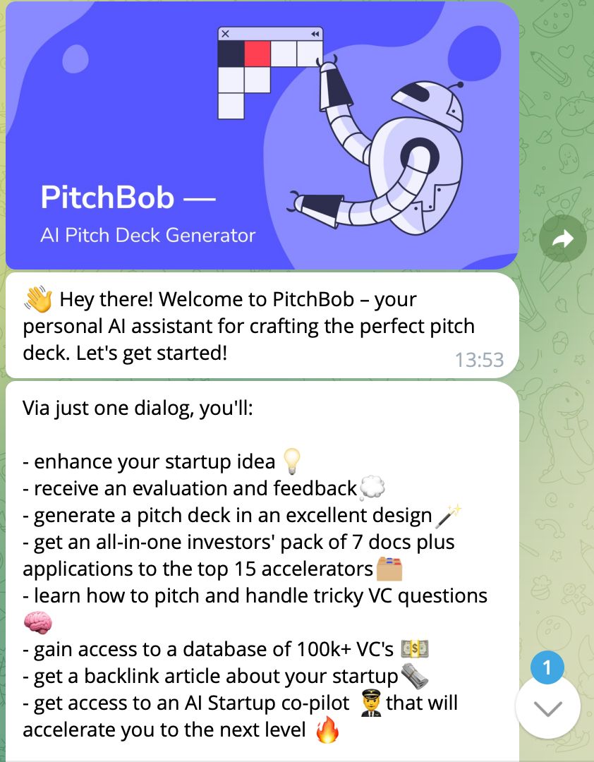 Well, it started as a simple pitch deck generator, which now operates on Facebook, Telegram, WhatsApp, and WeChat. The bot asks the user 40 questions. As you know, the correct question is half the answer. Therefore, we aimed to ask the right questions to initiate an internal reflection in the user, leading them to answers they hadn't reached before this dialogue.