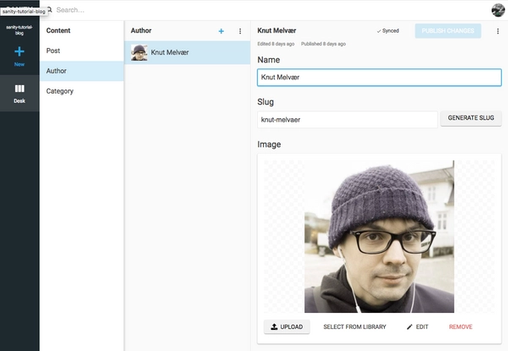 In the Content Studio you’ll discover, that you can add entries for authors and categories. Go and add at least one author with an image.