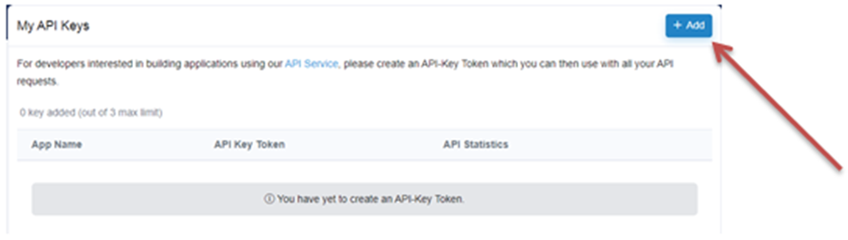Click on the blue tab that reads "+ Add" on the top right corner of this tab to add your API key.