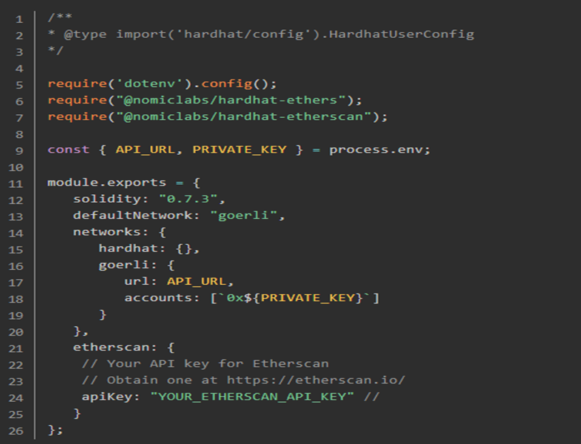 npm install –save-dev @nomiclabs/hardhat-etherscan - Next is to replace the hardhat.config.js with the hardhat-etherscan information in your file. Ensure you include your etherscan API key where required, as shown below:
